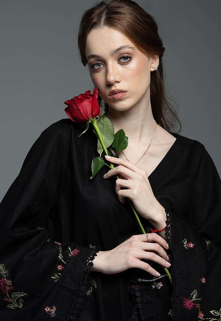"A striking black lawn ensemble featuring intricate black embroidery all over, highlighted with a rich purple embroidered border and matching sleeve patti. Paired with sleek black cotton culottes and an...