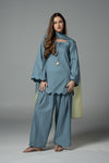This dull blue cotton shalwar kameez features a square neckline, giving a gentle, relaxed silhouette. Scalloped detailing along the border and sleeves adds a soft, feminine touch. The neckline is finished with a dori adorned with pastel yellow crochet flowers, adding a playful yet delicate accent. Two-colored dyed Organza dupatta with crochet flowers on all ends. Perfect for casual or festive wear, this outfit blends comfort with understated elegance.