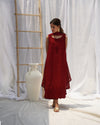 Burgundy is a full length shirt with chicken border and has lace details on the neckline and panels. It is paired with culottes and a chiffon dupatta.