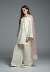 This off-white cotton short shirt and trouser set is designed with a relaxed, airy silhouette for effortless comfort. Pastel embroidery paired with delicate boring details softly adorns the outfit, creating a light and graceful look. The double-slit neckline is finished with twin doris, accented with hanging butterfly patches for a playful touch. Completed with an organza dupatta featuring subtle appliqués and boring and an inner shameez, this ensemble feels fresh, delicate, and perfect for Eid mornings.