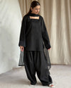 A black cotton outfit featuring a short shirt with a loose, comfortable fit. It has a square neckline and long, wide sleeves finished with thick lace. The back is styled with a dori and small flower accents for a pretty touch. It comes with a matching black cotton shalwar and a chiffon dupatta, detailed with lace along all four edges for a soft, elegant finish.