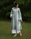 This graceful light grey lawn dress features elegant embroidery with chatta work all over the shirt. The round neckline is heavily embroidered, adding a touch of sophistication. The sleeves are adorned with embroidered patti, adding a neat and stylish detail, pairedthe with a matching chiffon dupatta with same color lace around 4 sides. It can be paired with white trousers that have pleats and delicate lace detailing on the hem.