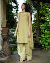 This stylish mustard outfit features a short shirt with a rounded square neckline and a sleeveless design. The front of the shirt is beautifully embroidered, adding a touch of elegance. It is paired with a matching Farshi shalwar, finished with embroidered patti on the paancha for a graceful traditional touch. Sleeves and a dupatta can also be included to complete the ensemble.