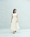 Ivory is a flowy two tier dress with a smooth fall. It consist of V shape neckline on front and back with a drawstring. It is gathered at under bust line that falls just below the calf length. It is tailored in light linen fabric.