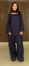 This navy blue set features a square neckline, tied with a dori at the back. The shirt has embroidery details on the sleeves and a flowy shalwar.