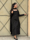 Obsidian is a black two-piece cotton set. The long A-line shirt has fitted sleeves and is finished with lace and pleat detailing on the neckline, sleeves, and border. It comes with matching trousers and can be paired with a chiffon dupatta trimmed with lace on all sides.