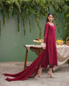 Scarlet Sorbet is the perfect red for everyone. With full embroidery on the front and back, the shirt is lifted with deep maroon lace details. The shirt is paired with a beautiful fully embroidered dupatta with chikankari borders and culottes.