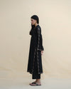 Siyah is a full-length shirt featuring brown embroidered patti on the borders and slits, extending to the back. The sleeves have brown patti on the hem, connecting to the shoulder line with a slit. This shirt includes an overlap neckline and is paired with straight trousers.
