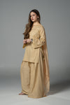 This beige cotton shalwar kameez is adorned with delicate seashell and starfish embellishments along the neckline and sleeves, paired with subtle pearl accents for a soft, elegant finish. The relaxed silhouette makes it airy and comfortable along with an inner shameez, while the playful, beachy details add a whimsical charm. Perfect for Eid celebrations, this ensemble blends gentle tones, textures, and thoughtful detailing for a refined yet fun look.