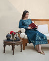Tropic features a teal khaddar long shirt with tight sleeves and an embroidered round neckline. It is embroidered in hues of greens. The outfit includes embroidered panels with lace, a border joined with lace, and fitted sleeves with embroidered hem. The shirt is paired with matching trousers.